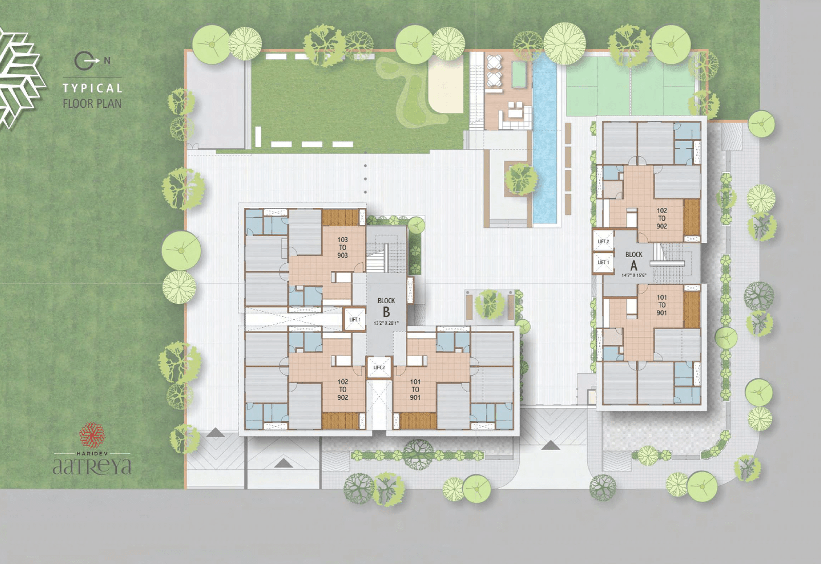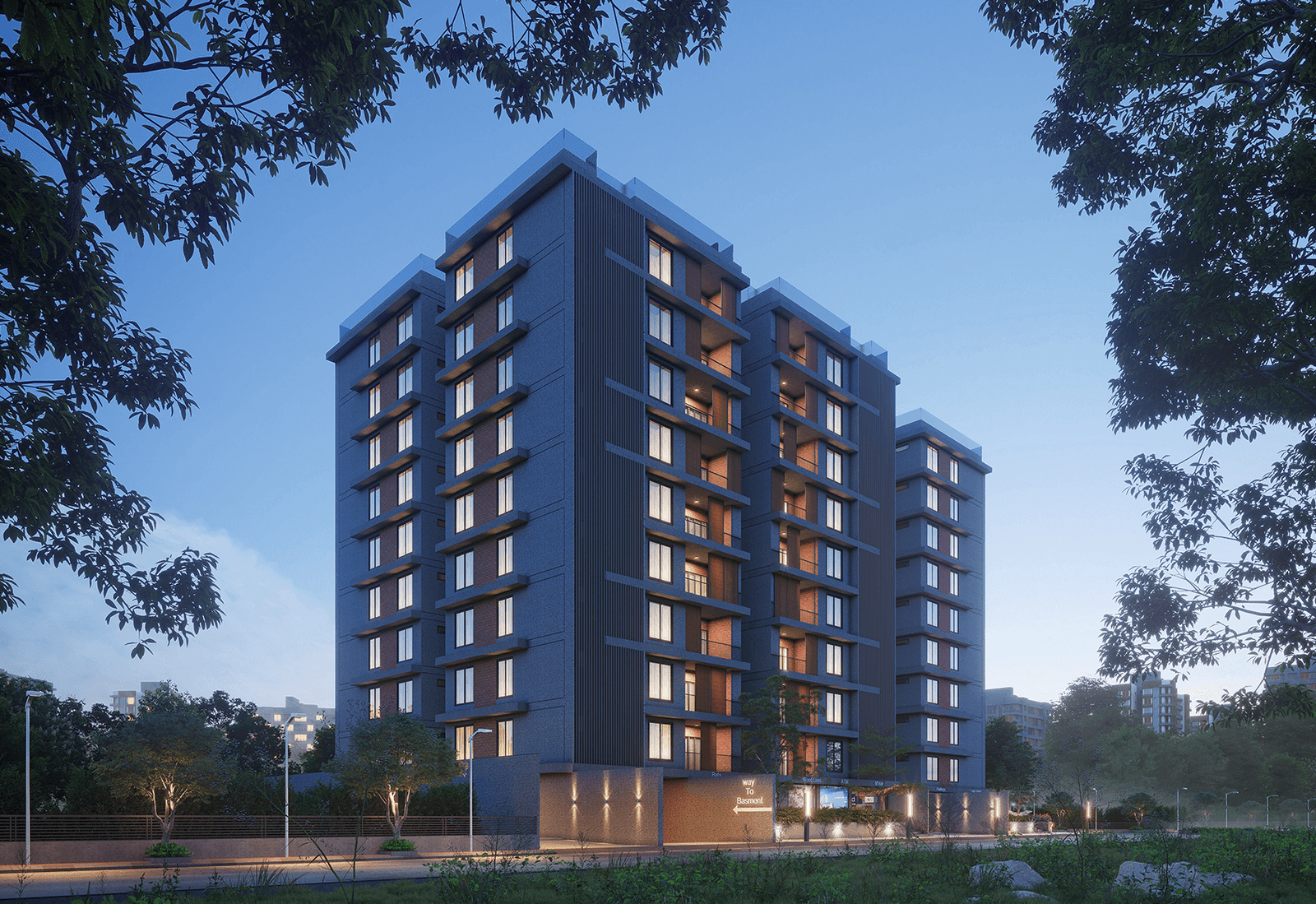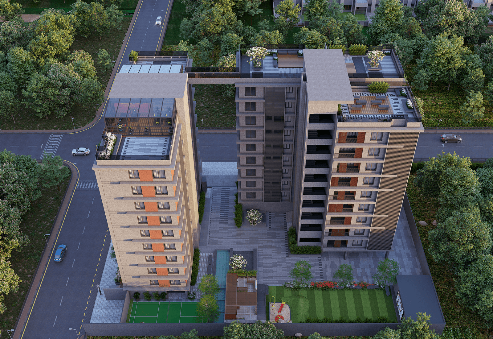 It is an exclusive scheme of 3BHK apartments for just 45 families aimed to create a harmonious living experience. Haridev Aatreya is located in a plush, serene location just off the SG Highway. Packed with all premium amenities like a meditation hall, badminton court, outdoor amphitheatre, rooftop gym, terrace garden, etc., to offer an unmatched lifestyle.